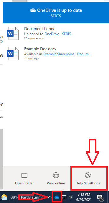 Click the OneDrive cloud icon in the bottom right corner of your screen, and then click settings: