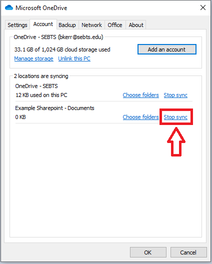 From the settings tab, click “Stop sync” on the SharePoint/OneDrive folder you would like to remove.